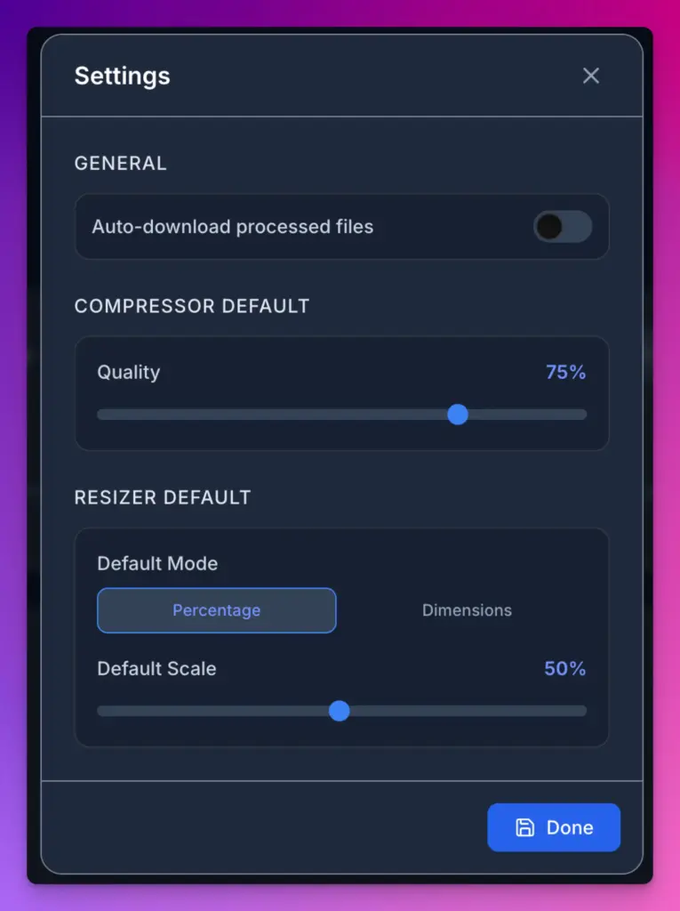This was important to me. I didn’t want to click the download button every single time I compressed images. With auto-download, the files would save automatically once processing finished. Plus, being able to set default values meant I wouldn’t have to adjust sliders every session.